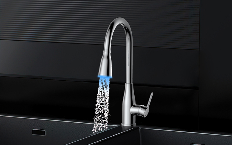 LED廚房抽拉龍頭;智能溫感芯片技術(shù),LED三種燈光顏色顯示溫水-涼水顯示藍(lán)色、溫水顯示綠色、熱水顯示紅色;抽拉頭多角度抽拉使用